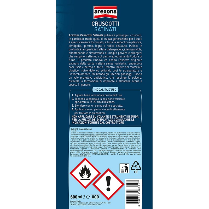 esclusiva formula igienizzante - arexons cruscotti satinati vanta una particolare ed esclusiva formula neutralizzante che pulisce in profondità la superficie trattata, detergendola, igienizzandola, allontanando e rimuovendo al meglio polvere e allergeni che vengono trattenuti sul panno per lucidare auto ed eliminando l'odore di fumo.