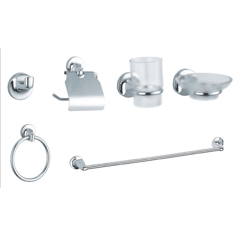 Set 6 pezzi bagno in metallo cromato con particolari in vetro satinato.