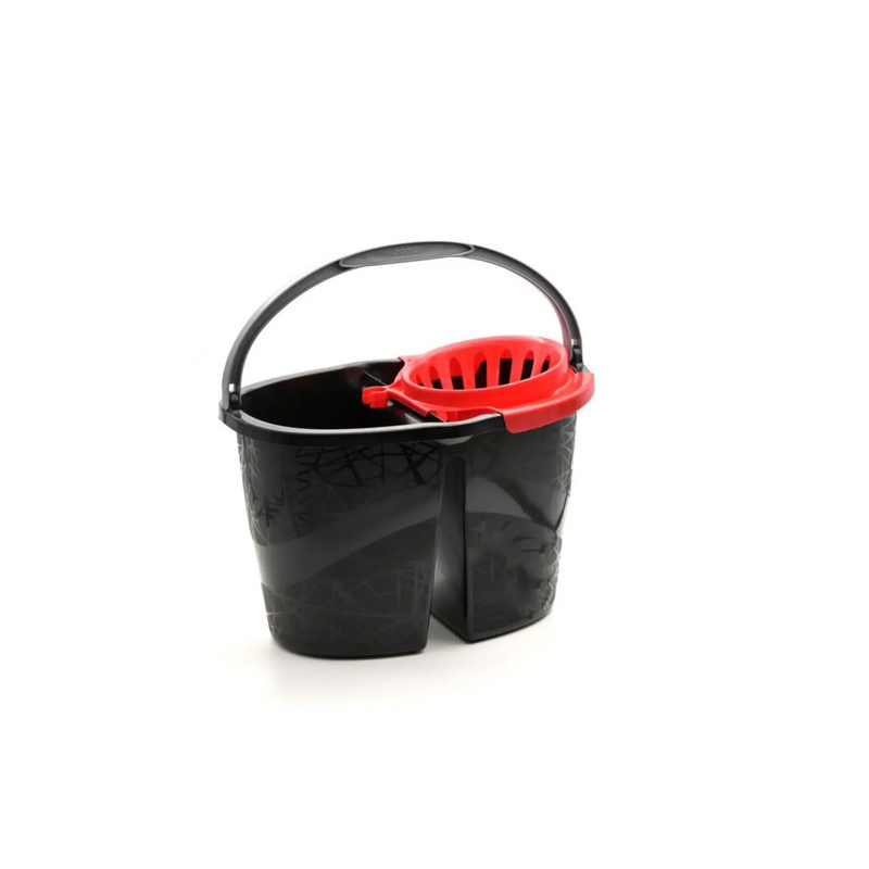 Secchio con doppia vasca per tenere separata l'acqua pulita da quella sporca; munito di strizzatore con appoggia manico.