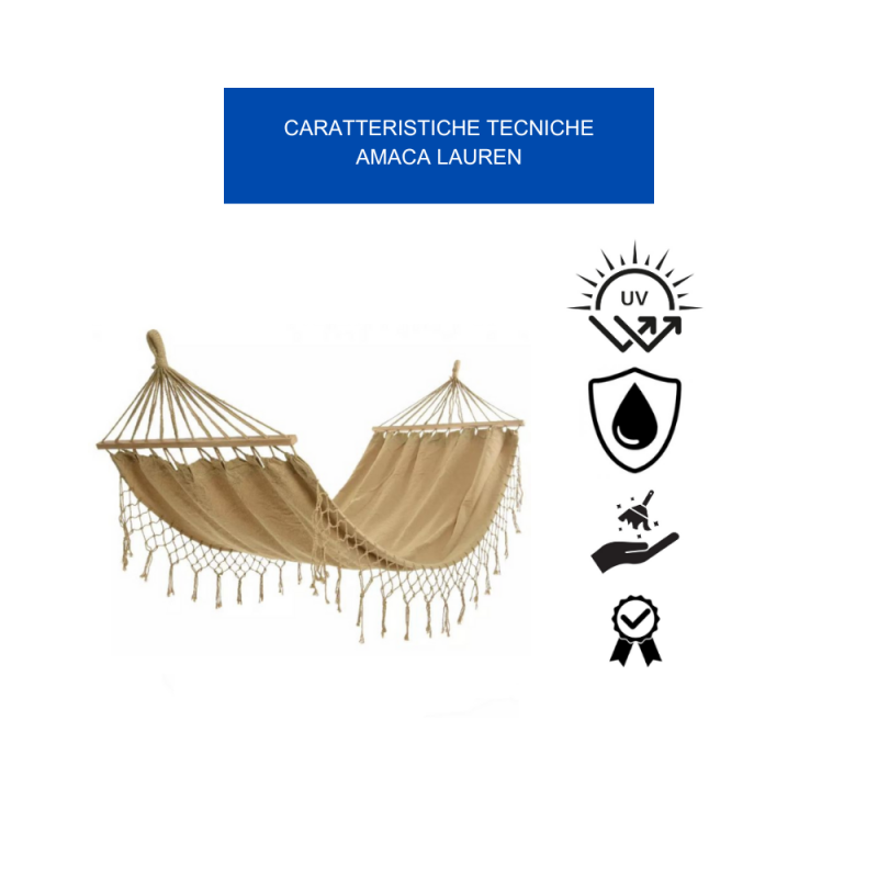 Realizzata In Poliestere Di Alta Qualità, L'Amaca Lauren Vanta Una Resistenza Eccezionale Alle Intemperie. Non Teme Né La Pioggia Battente, Né I Raggi Uv Del Sole, Né L'Umidità, Garantendoti Una Durata Nel Tempo Senza Paragoni. Potrai Goderti Il Tuo Angolo Di Relax In Giardino, Patio, Terrazza O In Qualsiasi Ambiente Esterno, Senza Preoccuparti Delle Condizioni Atmosferiche. Il Tessuto, Infatti, è Stato Appositamente Progettato Per Resistere All'Usura E Agli Strappi