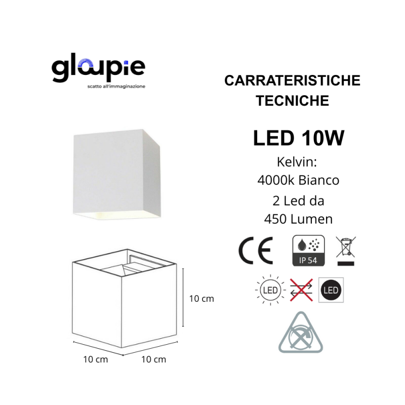 - Gloupie Applique Da Esterno Kelly,Alluminio Bianco,IP54, Potenza Massima 5W Luce Calda 4000K, L 10 X P 10 X H 10 Cm,Forma Cubica