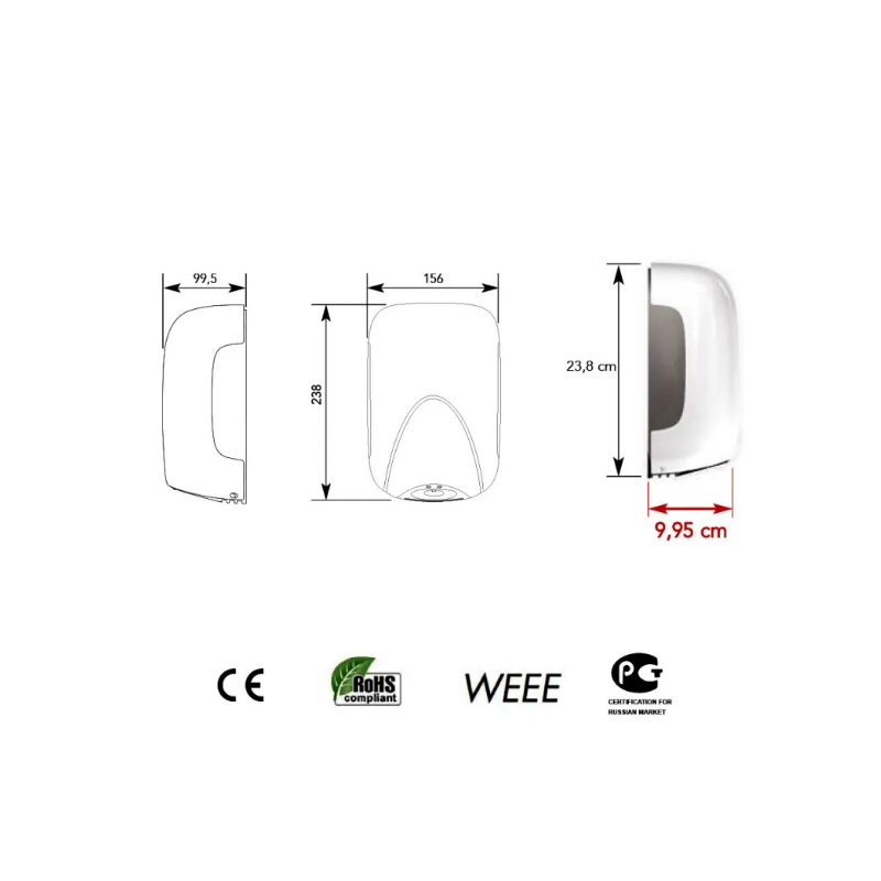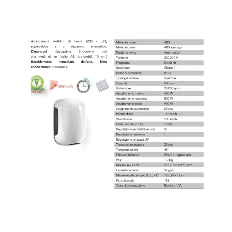 Questo è l'asciugamani più piccolo al mondo, superveloce con un tempo di asciugatura garantito in 20 sec. L'ingombro di questo asciugamani è pari alla metà di un foglio A4, con una profondità inferiore ai 10 cm. Garantisce infatti prestazioni eccezionali in soli 23,8 cm in altezza e 15,6 cm in larghezza: è considerato il più piccolo e compatto asciugatore mani elettrico esistente sul mercato. Il suo design è di nuova generazione, con la massima qualità estetica. Consente il massimo comfort durante l’asciugatura grazie al riscaldamento immediato dell’aria, mantenendo un eccezionale risparmio energetico, con consumi pari a soli 900W. E' raccomandato per qualsiasi contesto con requisiti di igiene mediamente elevati, come casa, bar, ristoranti e tante altre attività commerciali. L'asciugamano elettrico ha un ottimo rapporto performance - consumi - budget di spesa. Il suo funzionamento è automatico con distanza di induzione regolabile. E' 52 volte più economico rispetto ai rotoli di cotone e 40 volte rispetto alla carta