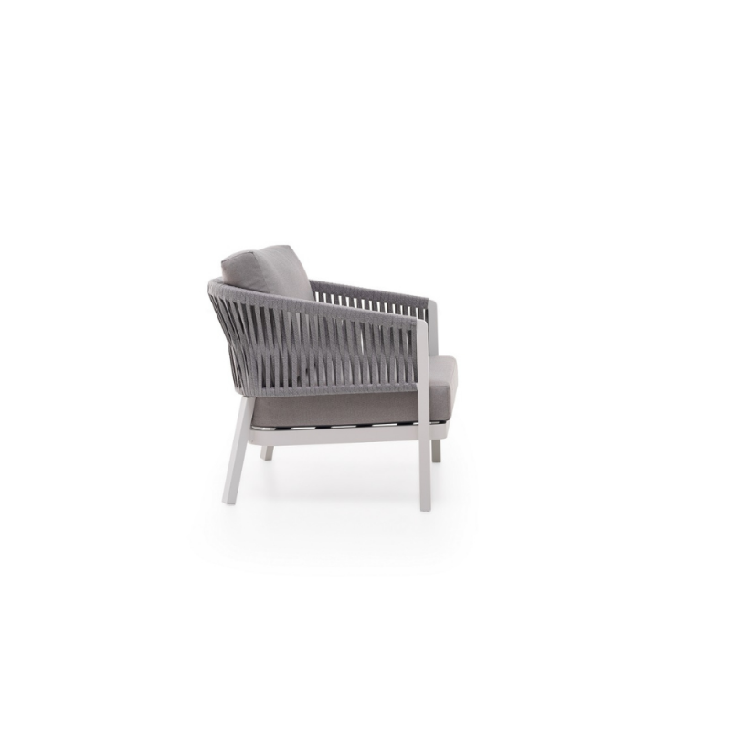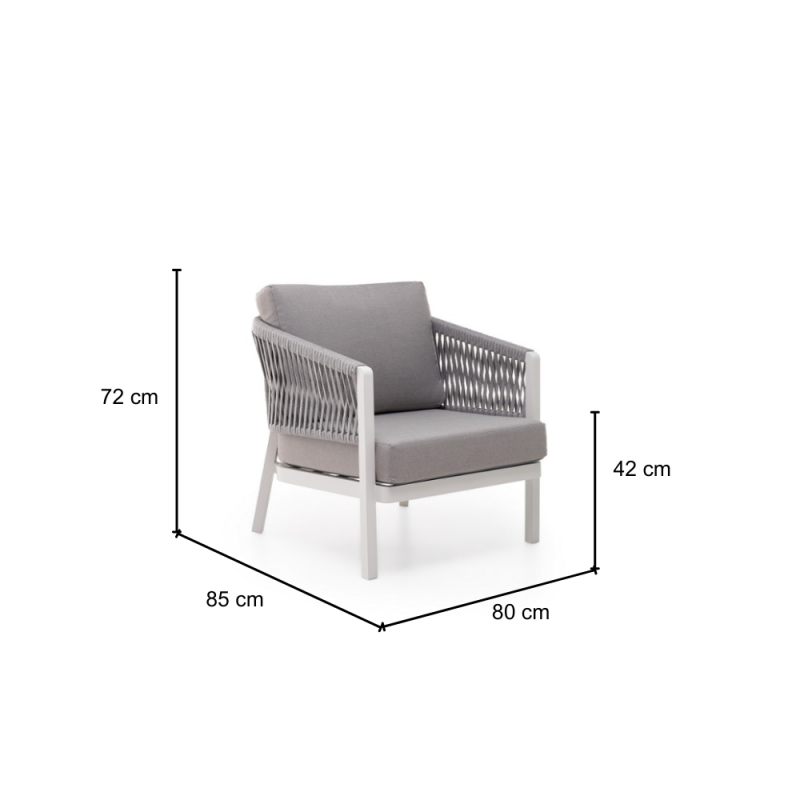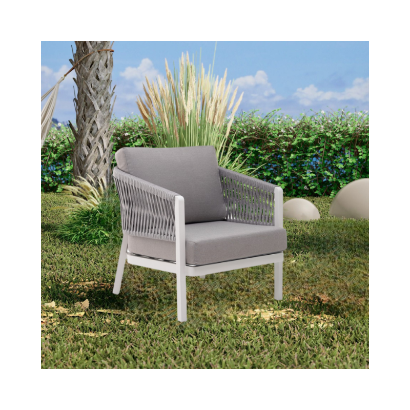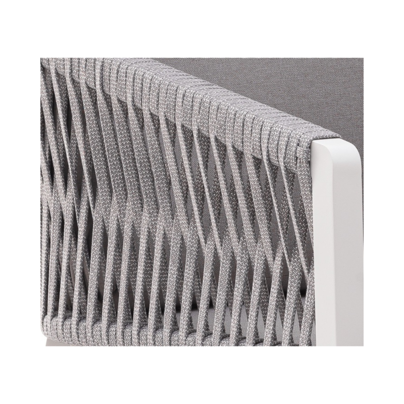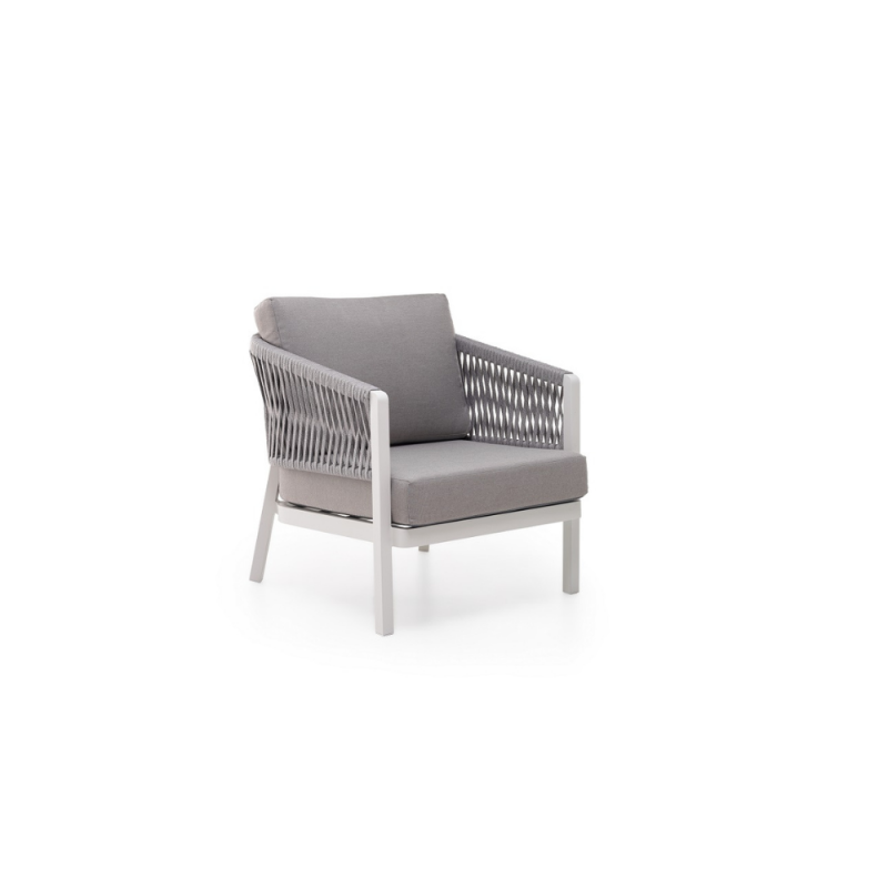 [QUALITA' CERTIFICATA]: KLULK Poltrona Da Esterno Barbados Con Struttura In Alluminio Verniciato A Polvere Di Poliestere Bianca Resistente Alle Intemperie, Ai Raggi UV, Ai Graffi Ed Agli Urti, Con Intreccio In Corde Di Tetoron 100% Poliestere Dall'Imbottitura In Gomma Polietilene, Completa Di Cuscino Seduta E Schienale Sfoderabile E Lavabile In Tessuto Olefin 100% Polipropilene Anti Ingiallimento E Usura Grigio Chiaro, Lunghezza 80 Cm X Profondità 85 Cm X Altezza 72 Cm