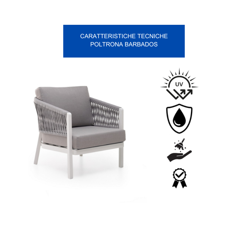 [ROBUSTEZZA FENOMENALE PER UN RELAX DURATURO]: La Poltrona Barbados è Realizzata Con Una Struttura In Alluminio Verniciato A Polvere Di Poliestere Bianca, Resistente A Pioggia, Sole, Graffi E Urti. L'Intreccio In Corde Di Tetoron 100% Poliestere Resistente Alle Intemperie, Si Rivela Morbido E Avvolgente Al Tatto, Garantendo Un Comfort Senza Pari. Completa L'Opera L'Imbottitura In Gomma Polietilene, Che Accarezza Il Corpo E Dona Un'Ulteriore Sensazione Di Morbidezza Per Un Relax Assoluto