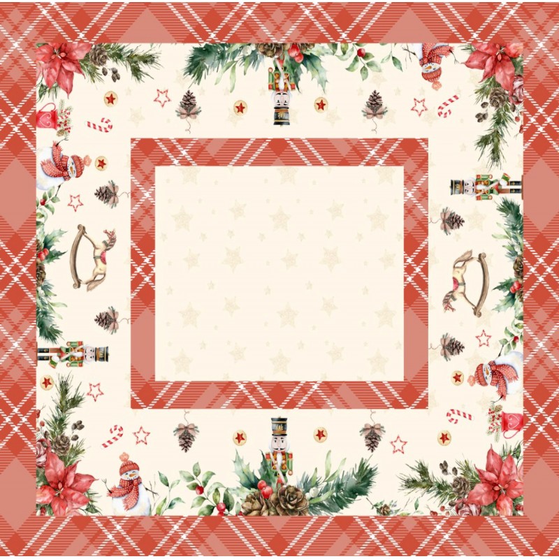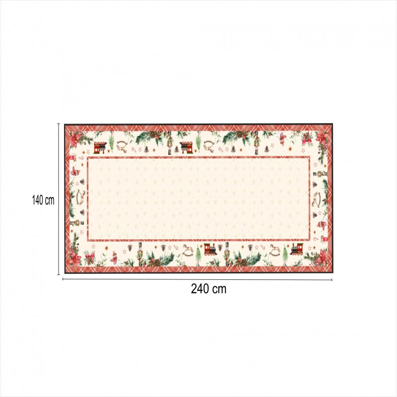 Design: La tovaglia natalizia è il tocco finale per creare un'atmosfera magica e festiva a tavola durante le festività natalizie. Con i suoi motivi tradizionali, come cavallucci, trenini, e schiaccianoci, il copritavolo trasporta subito i commensali nel magico mondo del natale. I colori vivaci e le forme gioiose dei motivi natalizi creano un'atmosfera di allegria e buonumore, perfetta per celebrare le festività in famiglia e con gli amici. La tovaglia natalizia è un'ottima idea regalo per chi ama le festività natalizie e desidera creare un'atmosfera speciale a tavola.