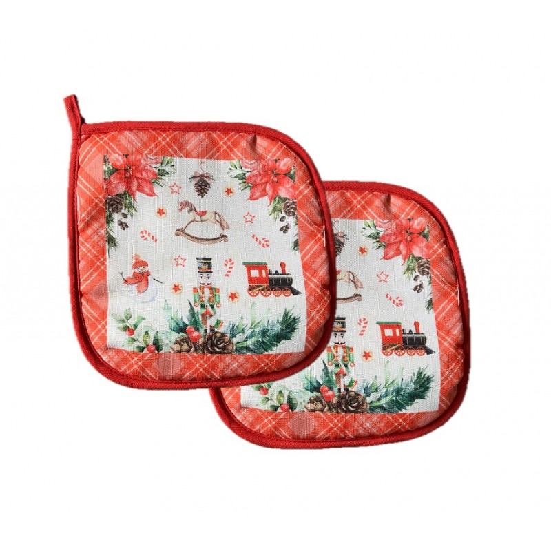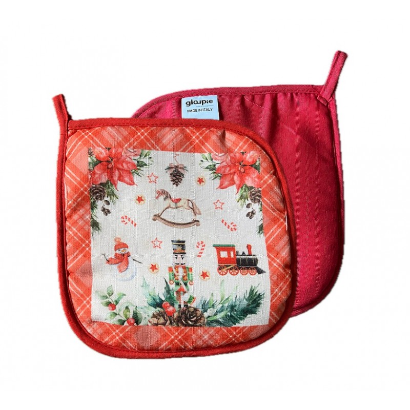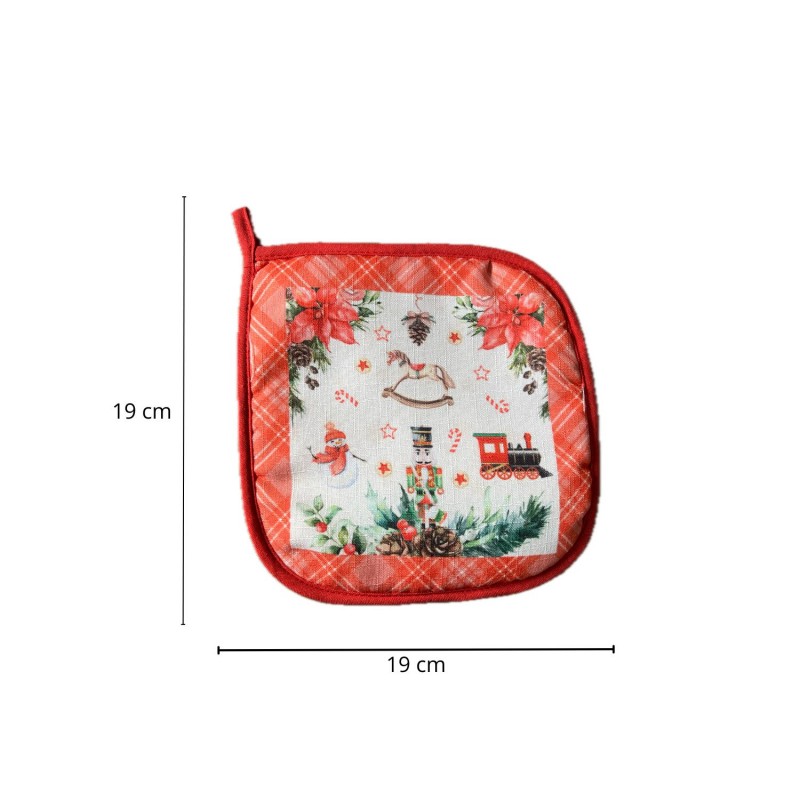 Design: La coppia di presine e' realizzata appositamente per festeggiare la festa più magica dell'anno, il natale. Con le presine natalizie, puoi portare un tocco di magia e allegria alla tua cucina, e rendere la preparazione dei piatti natalizi ancora più divertente. La fantasia che le contraddistingue ricalca infatti alcuni dei simboli più caratteristici del natale, ovvero pupazzi di neve, corone di bacche rosse e pigne, trenini, schiaccianoci e cavallucci, tutti pronti a risaltare nell'ambiente natalizio da te creato - di fondamentale importanza e' poi il laccio delle presine natalizie, che contribuisce a renderle ancora più decorative e pratiche, grazie alla tipica forma ad anello che permette di appenderle facilmente a un gancio o a un chiodo nella propria zona cucina