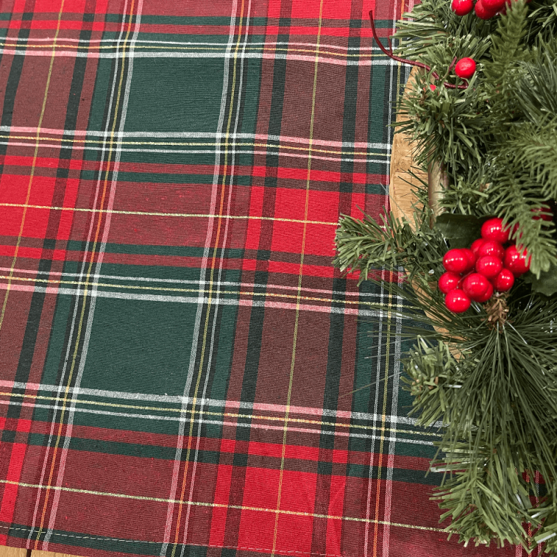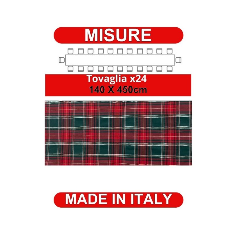 Materiale: La tovaglia natalizia e' realizzata in 50% cotone e 50% poliestere di alta qualità, un mix di materiali che rende il copritavola resistente agli strappi, non si restringe dopo intensi e ripetuti lavaggi, facile da pulire e assolutamente durevole nel tempo - caratteristica particolare del copritavola è la presenza di inserti in lurex color oro presenti sulla trama scozzese della tovaglia, volti a creare un effetto luminoso e scintillante che abbellisca ancor di più la tavola natalizia