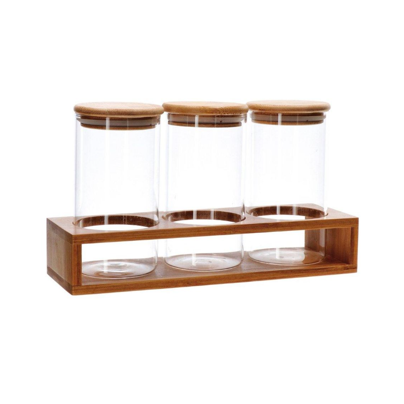 Set 3 Barattoli in Vetro con Base in Legno linea Boros 29x10x17 cm