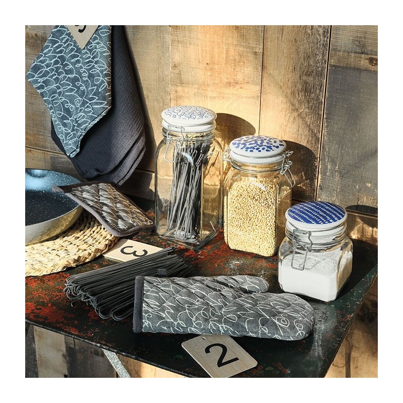 In vetro trasparente questo barattolo con base quadrata è dotato di un coperchio ermetico in ceramica caratterizzato da decori festosi sul bianco e il blu.