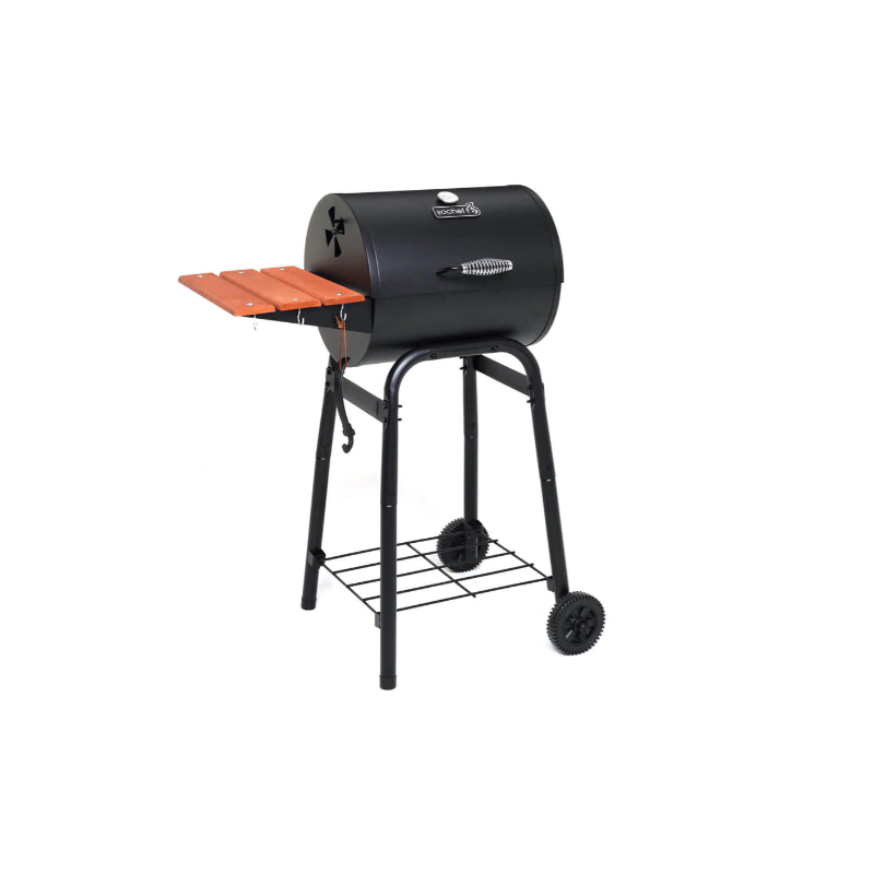 barbecue a carbone a forma di barile modello pedro 45 con pratico coperchio superiore dotato di termostato e due ruote per spostarlo facilmente.