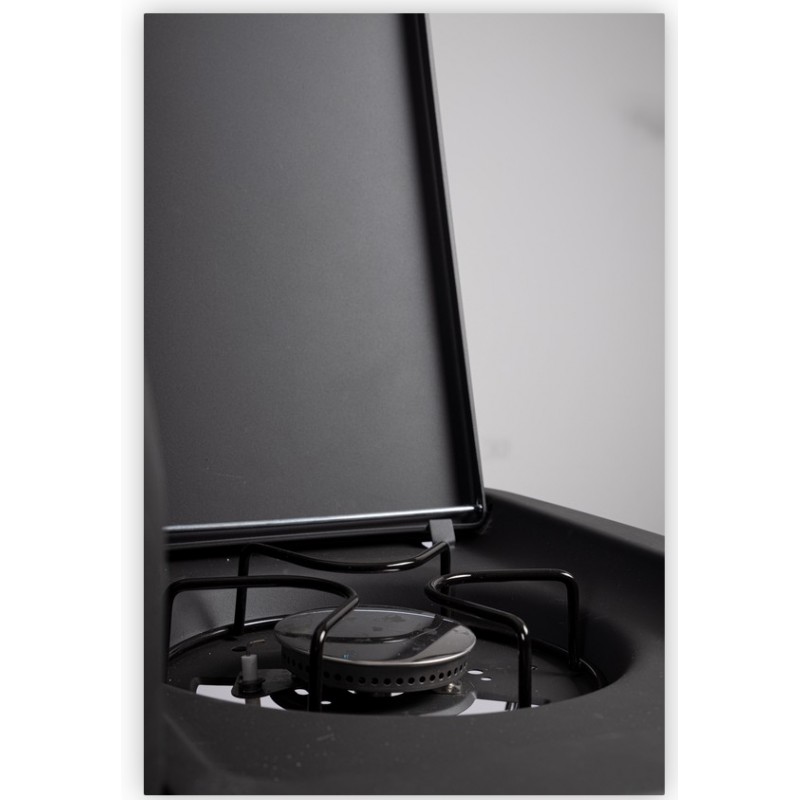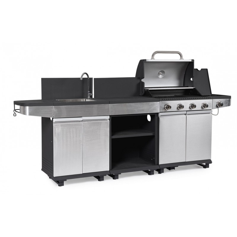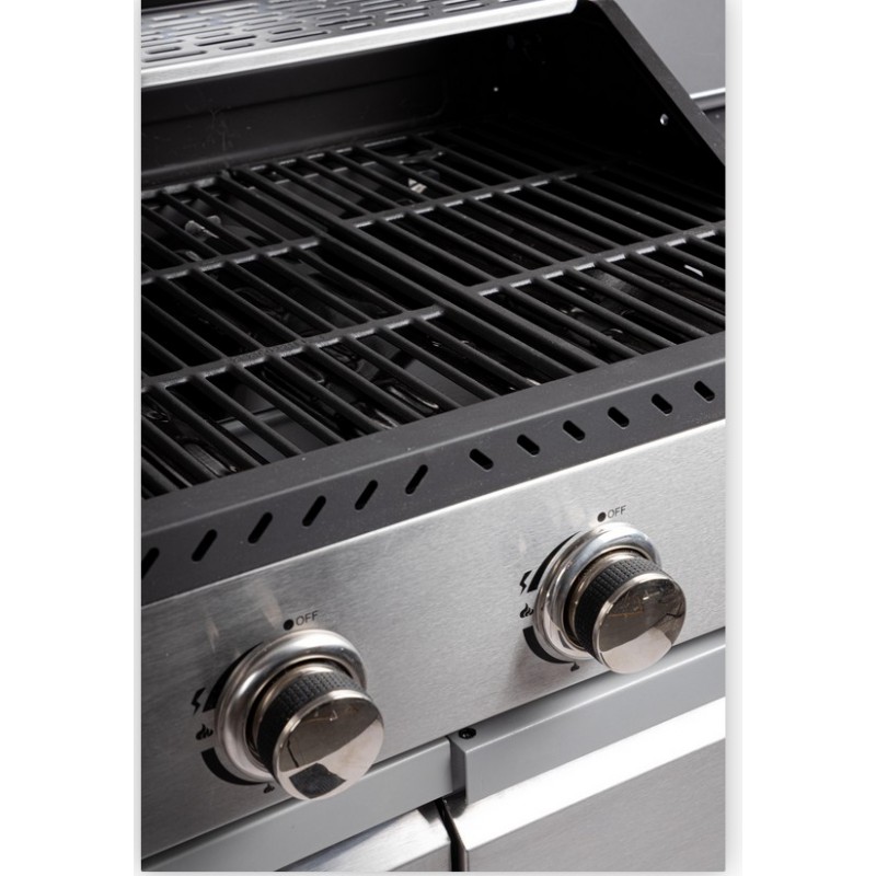 La griglia scaldavivande in acciaio inox (67,7 x 12 cm – 812 cm²) consente di mantenere caldi i piatti pronti, mentre i ripiani laterali e interni offrono tutto lo spazio necessario per utensili e ingredienti. Completano la dotazione un lavello integrato e accensione automatica per la massima comodità.