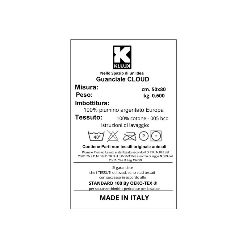 - KLULK Guanciale In Piuma D'oca Cloud, Imbottitura 100% Piumino Argentato Europa, Fodera 100% Cotone Twill, Misure 50 x 80 cm