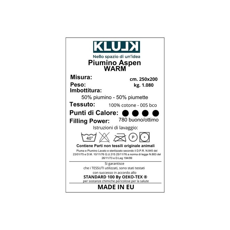 [LUNGA DURATA] : Materie Prime Di Alta Qualità, Piuma Bianca Vergine Classe 1 in conformità alla norma EN12934 Piumino Lavato e Sterilizzato secondo il D.P.R. N.845 del 23/1/75 e D.M. 10/11/76 G.U.315 25/11/76 a norma di legge N.883 del 26/11/73 e D.Leg. 194/99 inoltre i tessuti impiegati seguono gli STANDAR 100 by OEKO-TEX.