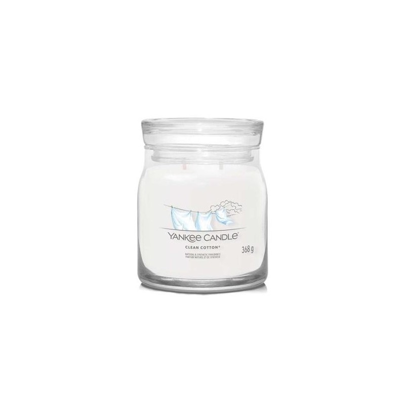 Yankee Candle Candela Giara Media Clean Cotton, è una fragranza Fresca e Pulita. Una fragranza che evoca il profumo del cotone asciugato al sole, ispirata a note verdi, fiori bianchi, con un tocco di limone.