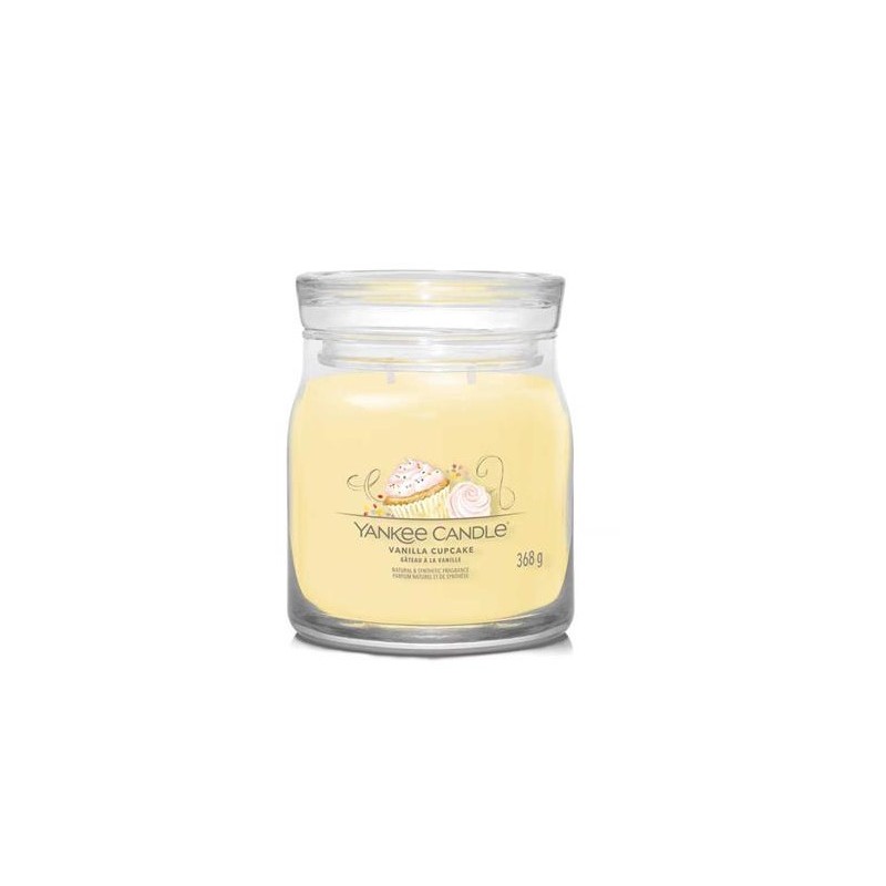 Yankee Candle Candela Giara Media Signature Vanilla Cupcake, Una fragranza che evoca il ricco e cremoso profumo dei cupcake alla vaniglia e che richiama le note di limone e di un abbondante e soffice strato di glassa.
