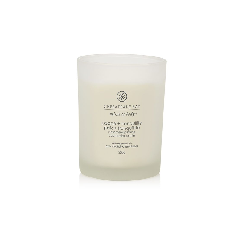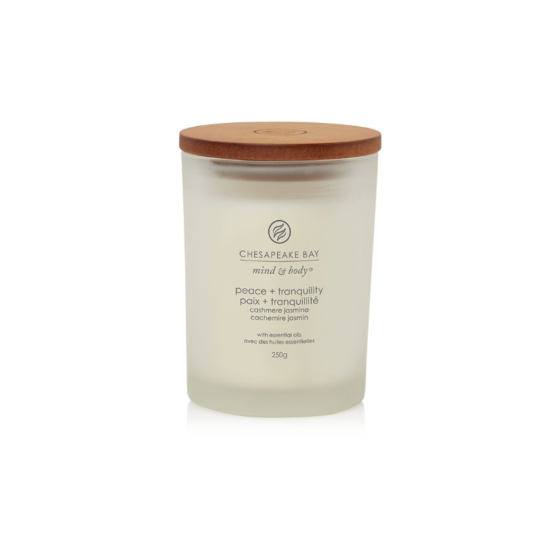 Candela Peace & Tranquility, dalle serene note che evocano l’esotico gelsomino, i delicati legni di cashmere, il muschio bianco e il legno di sandalo creando un tranquillo momento di pace