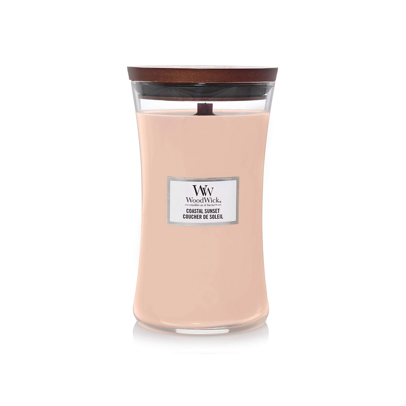 La Candela Clessidra Grande Large Coastal Sunset di Woodwick profuma comei fiiori di campo, invitanti sfumature di cocco e aria salmastra che catturano il caldo splendore del paesaggio costiero.