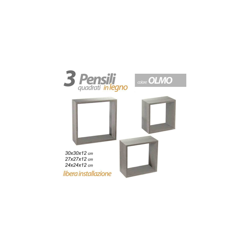 - Set 3 Pensili Sospesi A Forma Quadrata Da Parete in Legno Olmo A Libera Installazione