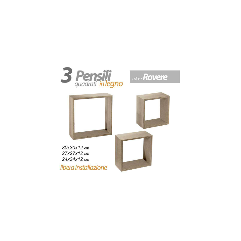 - Set 3 Pensili Sospesi A Forma Quadrata Da Parete in Legno Rovere A Libera Installazione