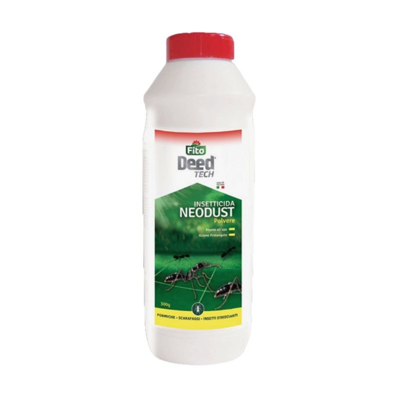 Insetticida formiche neodust fito polvere GR 750 In polvere leggerissima, pronta all'uso per il controllo degli insetti come: formiche, scarafaggi, pulci, pesciolini d'argento, punteruoli, dermestidi, tribolii e lasioderma. Gli insetti entrano in contatto con la polvere, si contaminano e la veicolano all'interno del nido. L'eradicazione della colonia avviene normalmente dopo una settimana. Composizione: Permetrina.