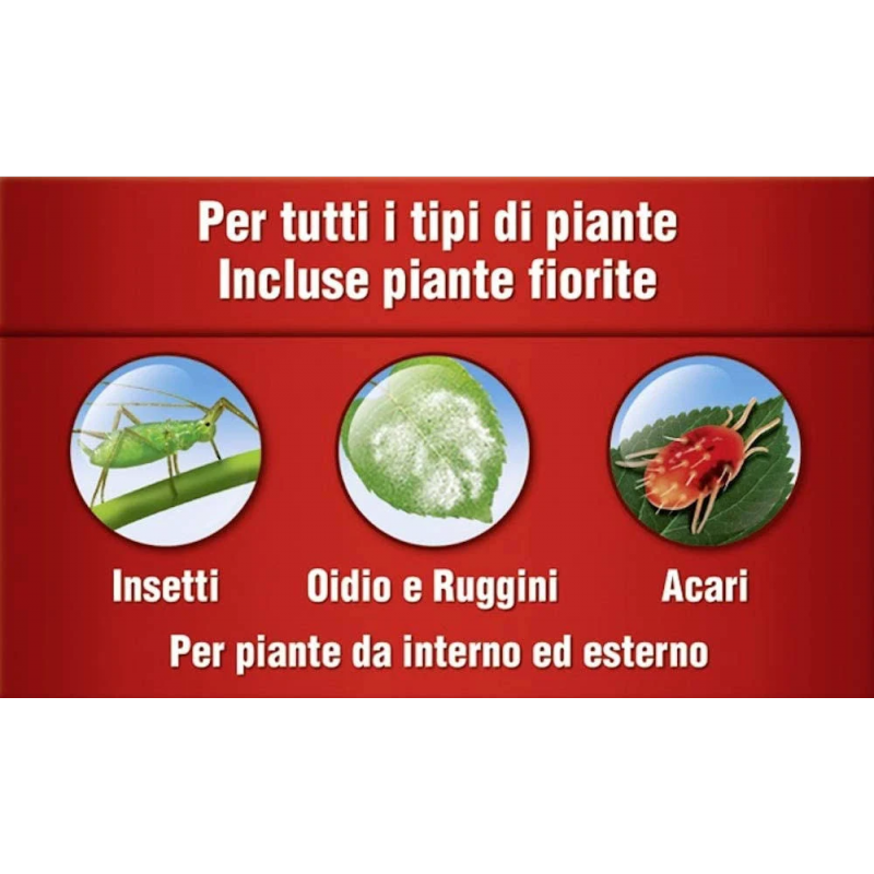 Controlla efficacemente insetti, acari e le principali malattie fungine quali: Afidi, larve di lepidotteri, Plusia, Bega, Nottue, Ragnetti rossi, Oidio e Ruggini.