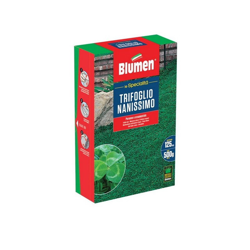 Blumen trifoglio nanissimo forma un tappeto erboso basso, folto e compatto che nel periodo primaverile si arricchisce di piccoli fiori bianchi. Predilige gli ambienti freschi ma resiste bene anche al caldo e alla siccità