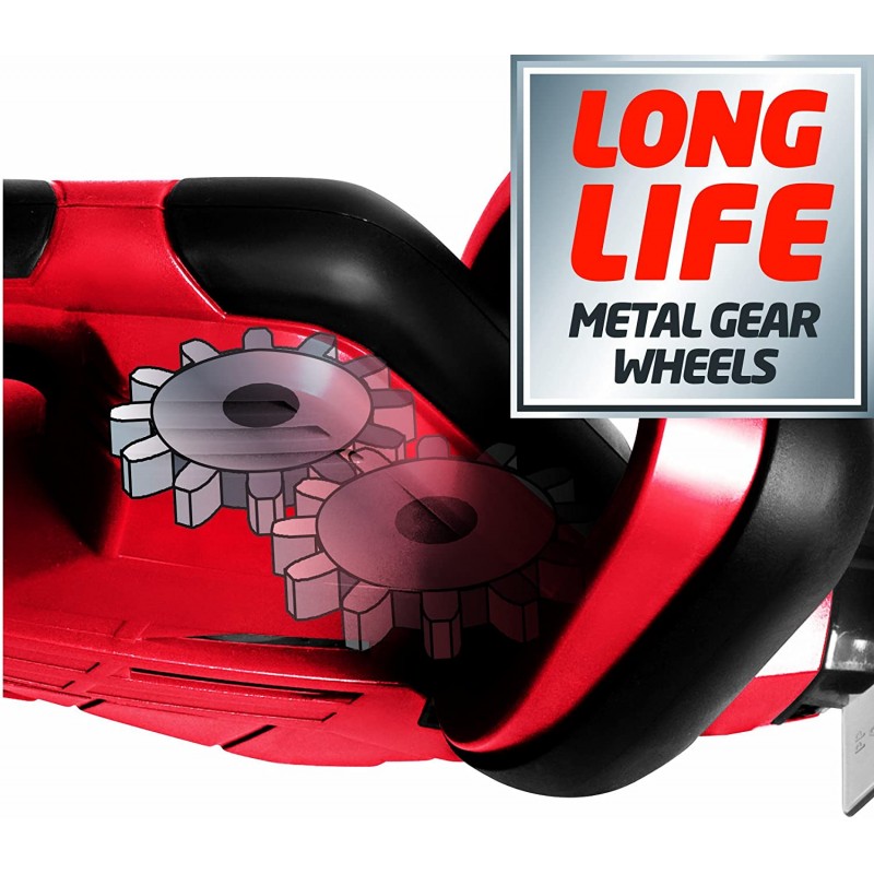 il tagliasiepi elettrico ha dei coltelli a movimento alternato in acciaio tagliati al laser e levigati al diamante, ingranaggi in metallo per maggior durata.