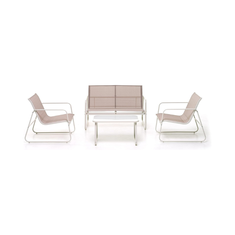 [Qualita' certificata]: Gloupie salotto da esterno per giardini, terrazze, patios, balconate 4 posti linea elon completo di divanetto, poltrone e tavolino con struttura in metallo verniciato a polvere epossidica dalle diverse colorazioni e seduta in textilene resistente alle intemperie e ai raggi uv, piano del tavolino in vetro temperato, facile da assemblare in poco tempo, misure divanetto l 113 x p 80 x h 77 cm; poltrona l 61 x p 80 x h 77 cm; tavolino l 85 x p 50 x h 39 cm