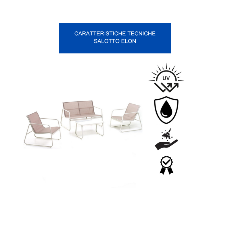 [Robustezza e durata per un investimento sicuro]: Il salottino è realizzato con materiali di alta qualità che garantiscono robustezza e durata nel tempo. La struttura in metallo verniciato a polvere epossidica resiste agli agenti atmosferici e all'usura, mentre il textilene delle sedute mantiene intatte le sue caratteristiche di comfort e resistenza anche dopo lunghe esposizioni al sole e alle intemperie. Scegliere elon significa arredare il vostro spazio esterno con stile e funzionalità