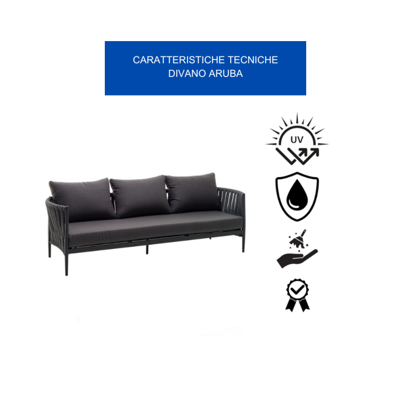 [ROBUSTEZZA FENOMENALE PER UN RELAX DURATURO]: Il Divano Aruba è Realizzato Con Una Struttura In Alluminio Verniciato A Polvere Di Poliestere Antracite, Resistente A Pioggia, Sole, Graffi E Urti. L'Intreccio In Corde Di Tetoron 100% Poliestere Resistente Alle Intemperie, Si Rivela Morbido E Avvolgente Al Tatto, Garantendo Un Comfort Senza Pari. Completa L'Opera L'Imbottitura In Gomma Polietilene, Che Accarezza Il Corpo E Dona Un'Ulteriore Sensazione Di Morbidezza Per Un Relax Assoluto