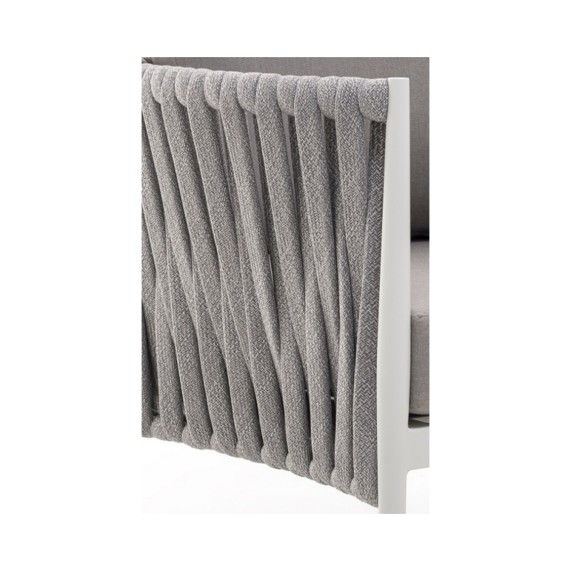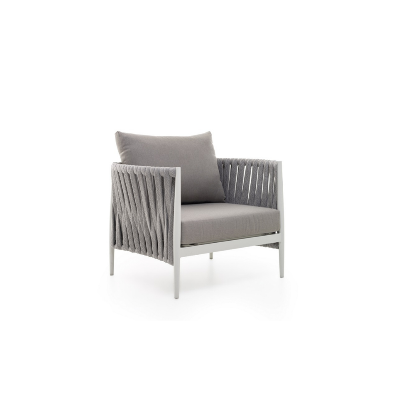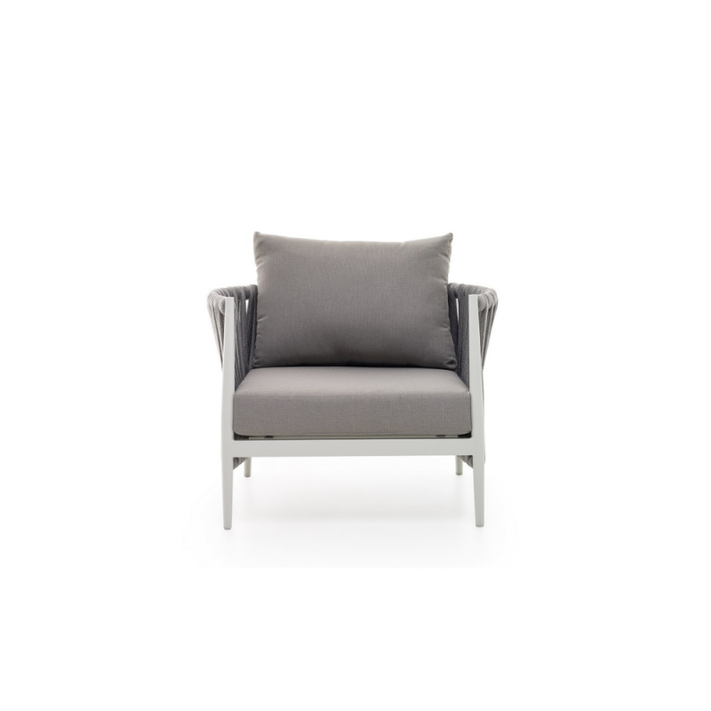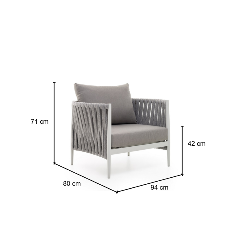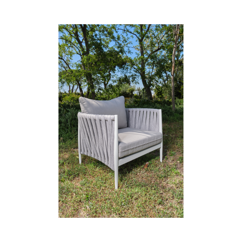 [QUALITA' CERTIFICATA]: KLULK Poltrona Da Esterno Aruba Con Struttura In Alluminio Verniciato A Polvere Di Poliestere Bianca Resistente Alle Intemperie, Ai Raggi UV, Ai Graffi Ed Agli Urti, Con Intreccio In Corde Di Tetoron 100% Poliestere Dall'Imbottitura In Gomma Polietilene, Completa Di Cuscino Seduta E Schienale Sfoderabile E Lavabile In Tessuto Olefin 100% Polipropilene Anti Ingiallimento E Usura Grigio Chiaro, Lunghezza 94 Cm X Profondità 80 Cm X Altezza 71 Cm