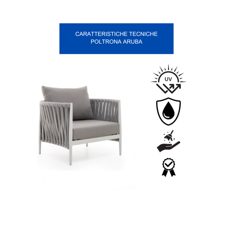 [ROBUSTEZZA FENOMENALE PER UN RELAX DURATURO]: La Poltrona Aruba è Realizzata Con Una Struttura In Alluminio Verniciato A Polvere Di Poliestere Bianca, Resistente A Pioggia, Sole, Graffi E Urti. L'Intreccio In Corde Di Tetoron 100% Poliestere Resistente Alle Intemperie, Si Rivela Morbido E Avvolgente Al Tatto, Garantendo Un Comfort Senza Pari. Completa L'Opera L'Imbottitura In Gomma Polietilene, Che Accarezza Il Corpo E Dona Un'Ulteriore Sensazione Di Morbidezza Per Un Relax Assoluto