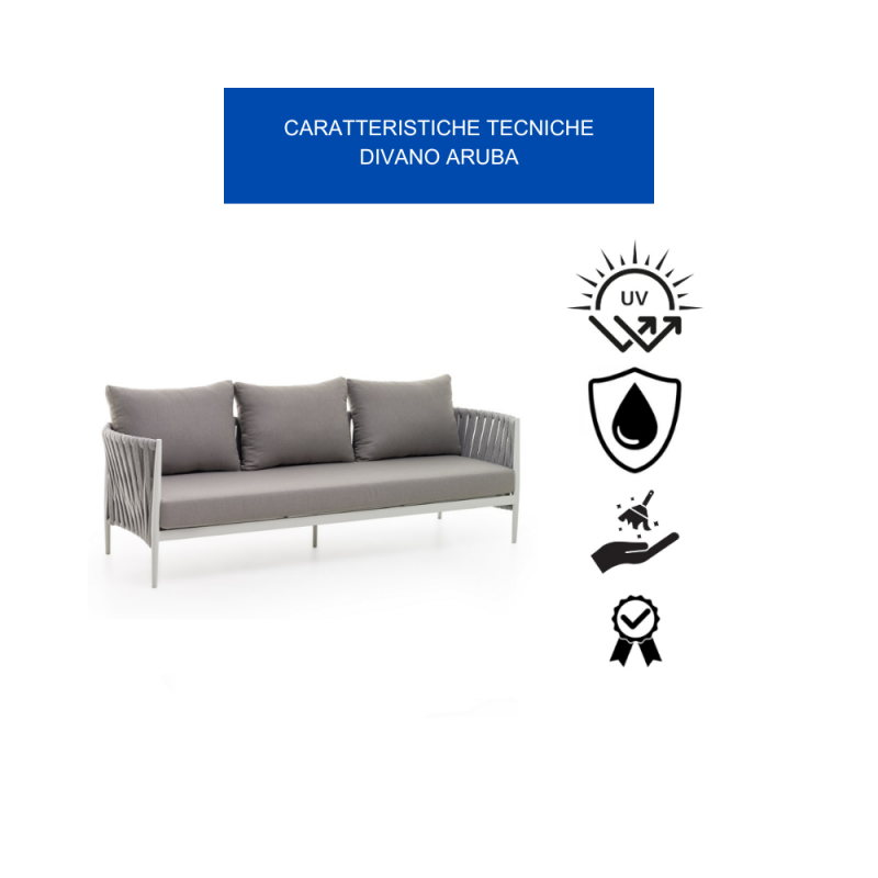 [ROBUSTEZZA FENOMENALE PER UN RELAX DURATURO]: Il Divano Aruba è Realizzato Con Una Struttura In Alluminio Verniciato A Polvere Di Poliestere Bianca, Resistente A Pioggia, Sole, Graffi E Urti. L'Intreccio In Corde Di Tetoron 100% Poliestere Resistente Alle Intemperie, Si Rivela Morbido E Avvolgente Al Tatto, Garantendo Un Comfort Senza Pari. Completa L'Opera L'Imbottitura In Gomma Polietilene, Che Accarezza Il Corpo E Dona Un'Ulteriore Sensazione Di Morbidezza Per Un Relax Assoluto Nella Propria Zona Da Esterno