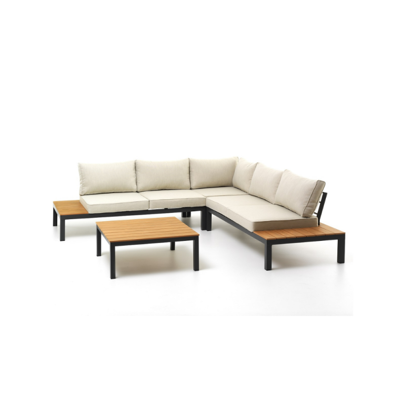 KLULK Salotto Angolare 5 Posti Polignano Completo Di Divanetti, Tavolino E Cuscini In Acciaio Antracite Con Inserti In Polywood