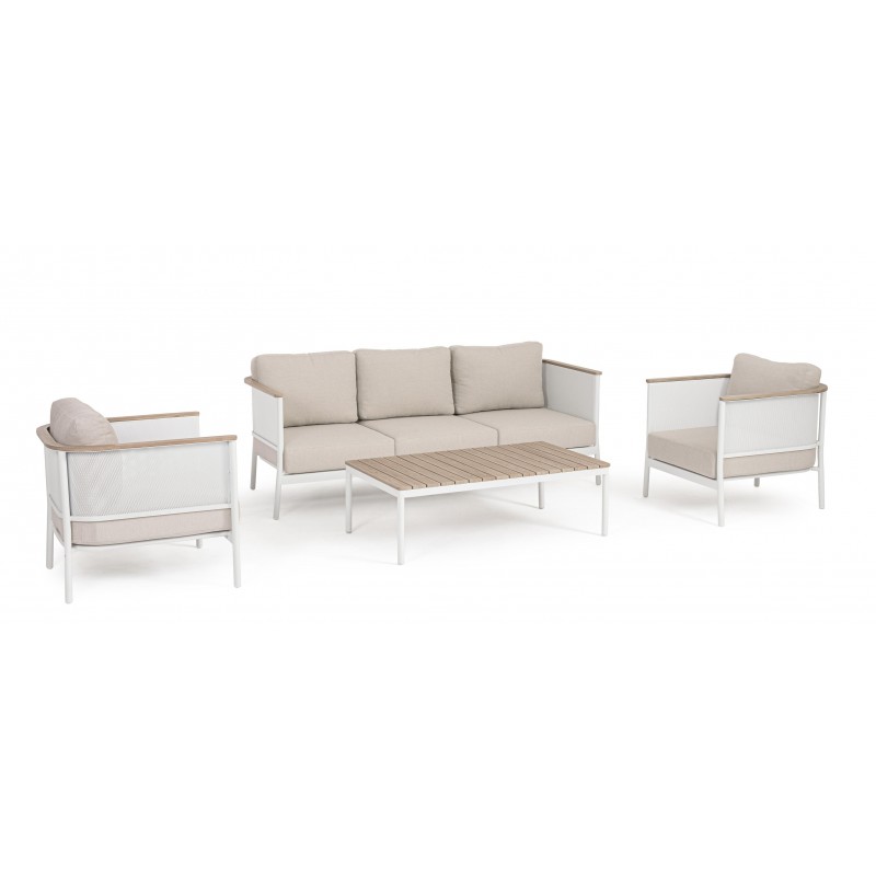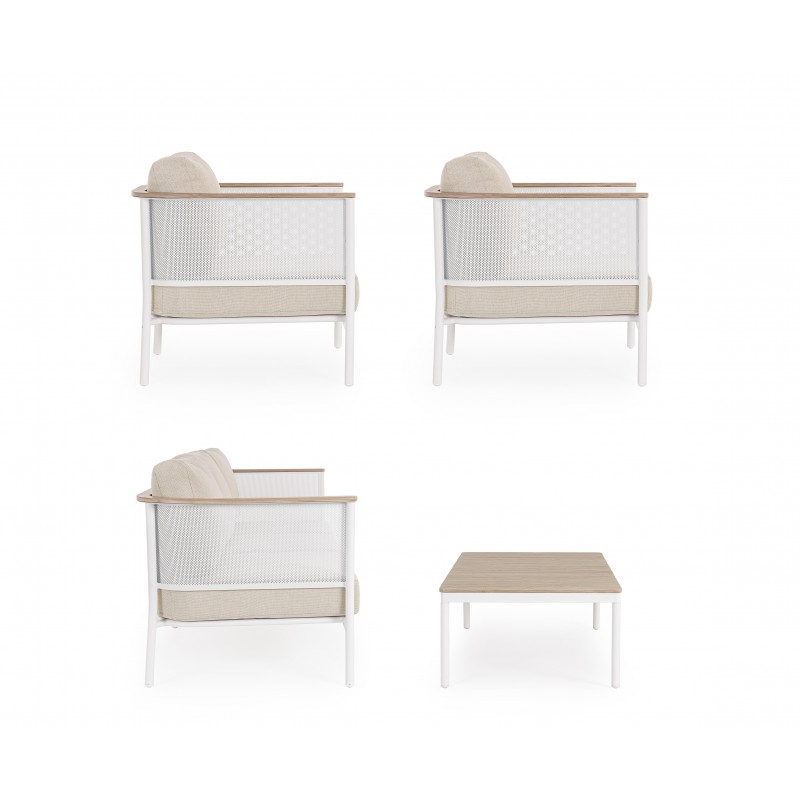 Il set salotto C-C Ulises Vapor YK15 è caratterizzato da una struttura in alluminio verniciato a polvere (poliestere), che offre robustezza e resistenza agli agenti atmosferici. I braccioli e il piano del tavolino sono realizzati in alluminio con finitura effetto legno, combinando eleganza e praticità. I cuscini della seduta e dello schienale sono sfoderabili, realizzati con tessuto idrorepellente Olefin (100% polipropilene), ideale per l’uso esterno. Le gambe del tavolino sono dotate di viteria in acciaio inox e necessitano di un semplice assemblaggio.