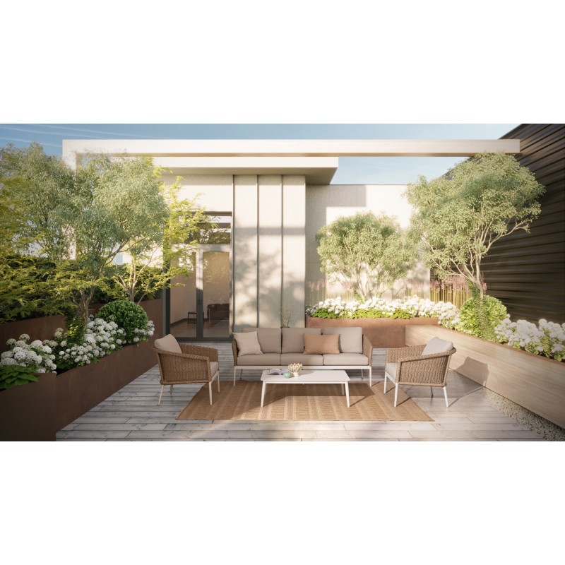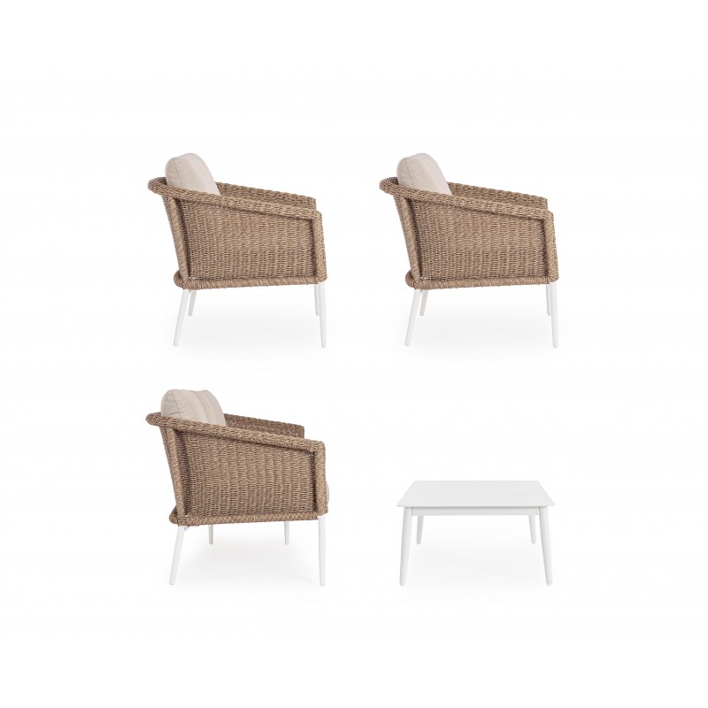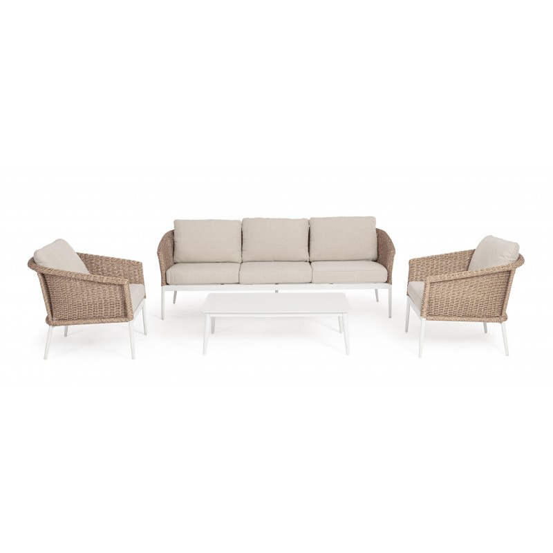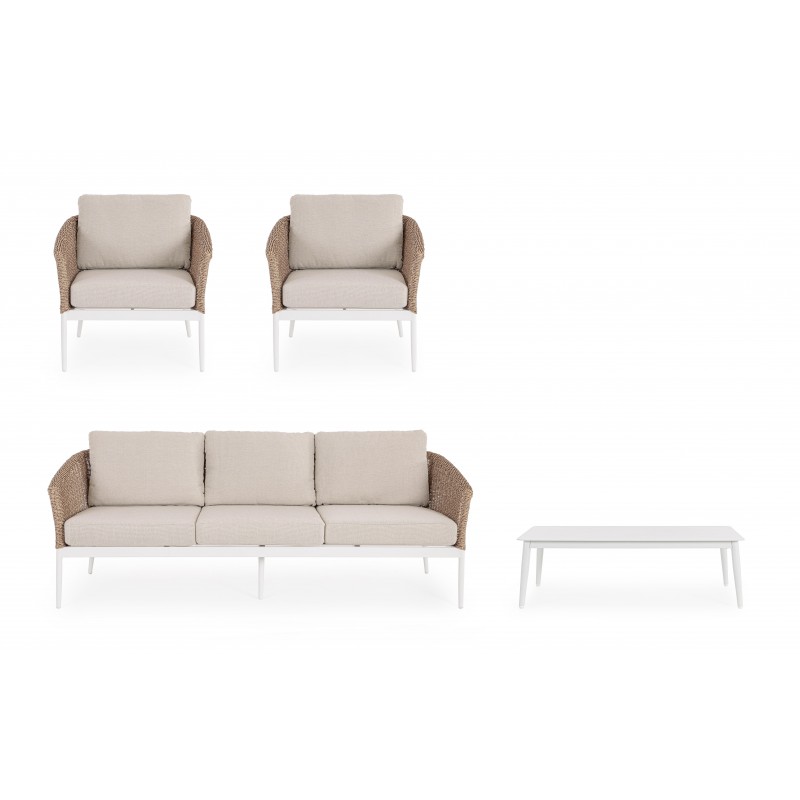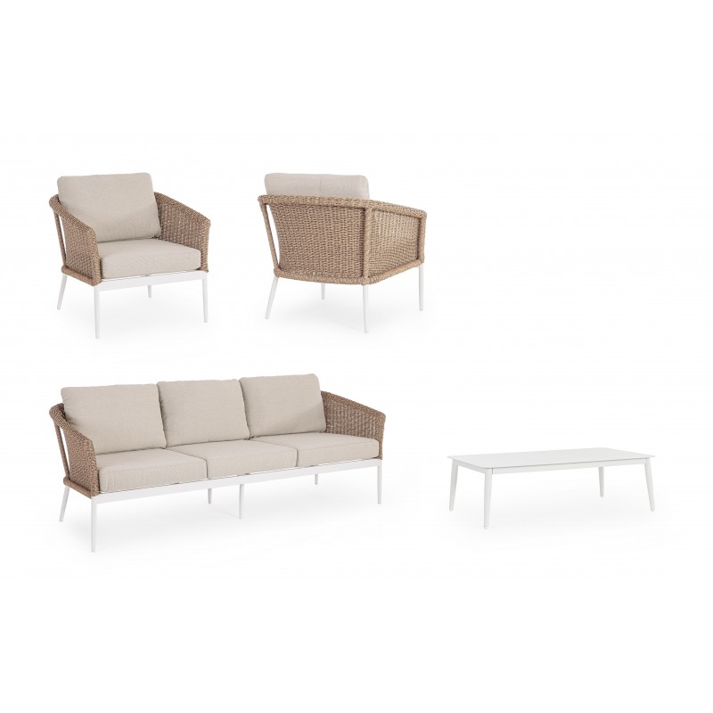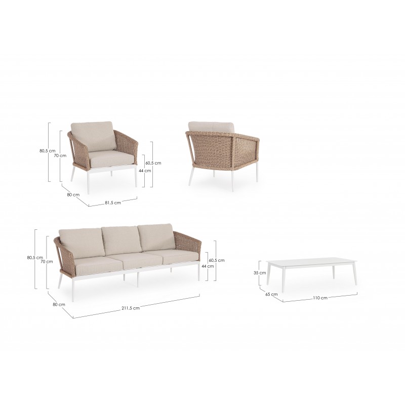 La seduta è rivestita in fibra sintetica tonda da 3.5mm, mentre i cuscini di seduta e schienale sono sfoderabili e realizzati con tessuto idrorepellente Olefin (100% polipropilene), ideale per un comfort duraturo. Le gambe del tavolino sono dotate di piedini regolabili e viteria in acciaio inossidabile.