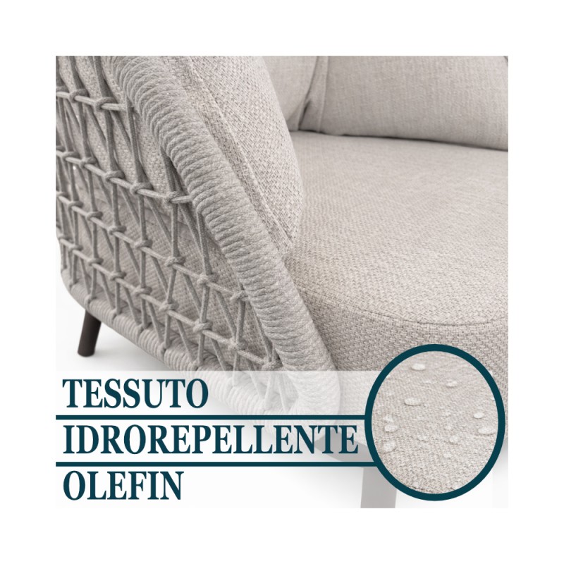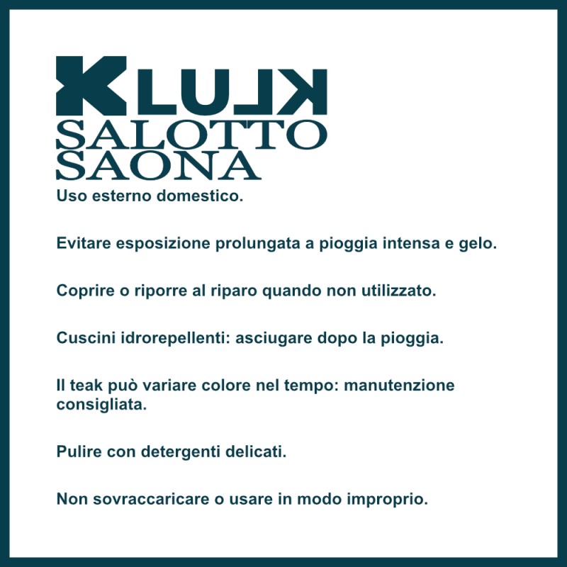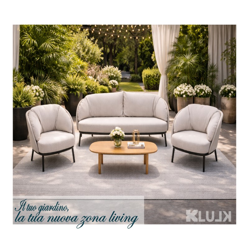 [ROBUSTEZZA FENOMENALE PER UN RELAX DURATURO]: Il salotto da esterno KLULK Saona è progettato per offrire solidità, resistenza e comfort nel tempo. La struttura in alluminio verniciato a polvere di poliestere garantisce un’elevata resistenza a pioggia, raggi UV, graffi e urti, rendendolo perfetto per un utilizzo prolungato all’aperto senza compromessi. L’intreccio in corde di Tetoron (100% poliestere) unisce robustezza ed eleganza, assicurando una seduta stabile ma allo stesso tempo accogliente e confortevole. A completare il tutto, l’imbottitura in gomma polietilene (Quick Dry Foam) offre un comfort superiore e una rapida asciugatura, ideale per mantenere il massimo relax.[CUSCINI SFODERABILI E LAVABILI PER UNA PULIZIA SEMPLICE]: I cuscini sono realizzati in tessuto Olefin (100% polipropilene) color grigio chiaro, un materiale resistente all’ingiallimento e all’usura, capace di mantenere nel tempo la sua bellezza e qualità. Completamente sfoderabili e lavabili in lavatrice, garantiscono una manutenzione pratica e veloce. Inoltre, sono dotati di una base antiscivolo, che li mantiene sempre stabili e perfettamente aderenti alla struttura, assicurando un comfort ottimale in ogni momento.