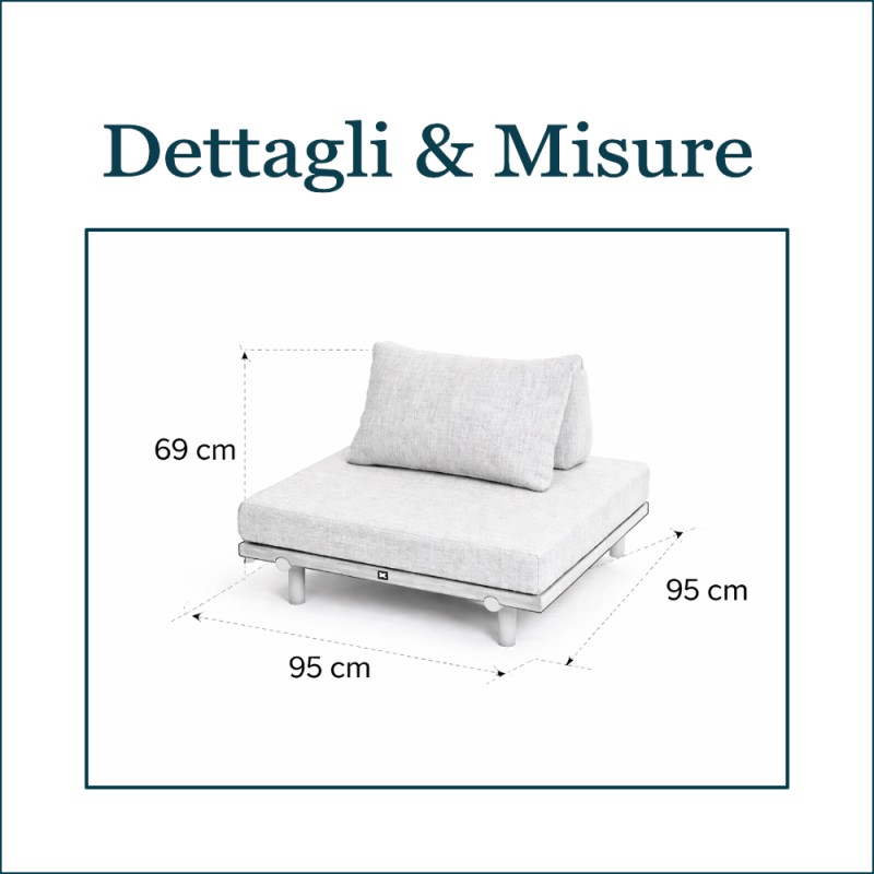 I cuscini sono realizzati in tessuto Olefin (100% polipropilene) color grigio chiaro, un materiale resistente all’ingiallimento e all’usura, capace di mantenere nel tempo la sua bellezza e qualità. Completamente sfoderabili e lavabili in lavatrice, garantiscono una manutenzione pratica e veloce. Inoltre, sono dotati di una base antiscivolo, che li mantiene sempre stabili e perfettamente aderenti alla struttura, assicurando un comfort ottimale in ogni momento.