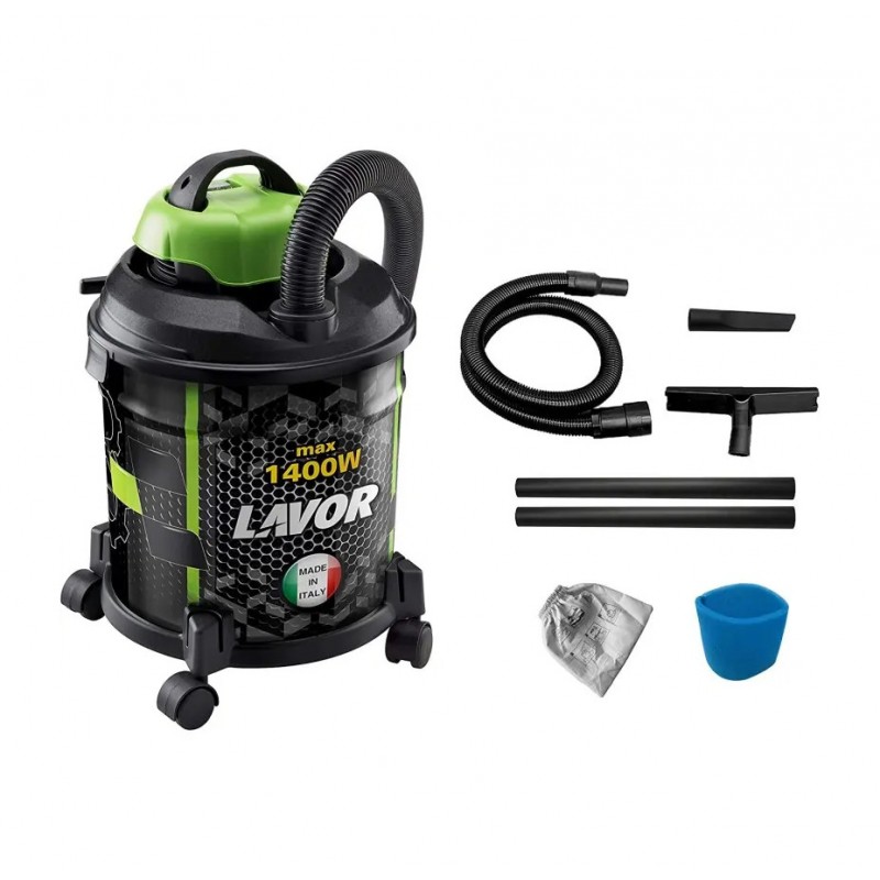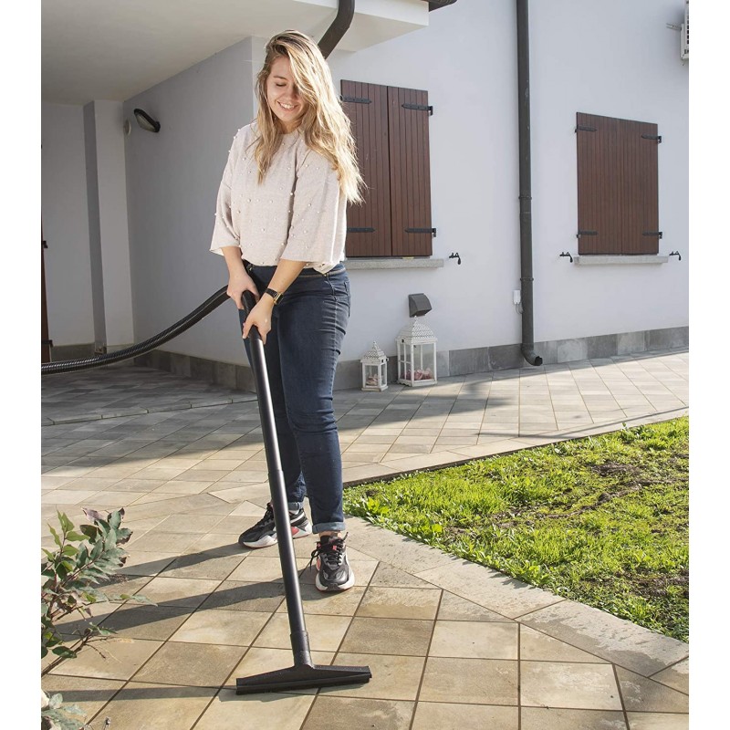 bidone aspirasolidi e aspiraliquidi con fusto da 20 litri, motore da 1400 watt max, potenza di aspirazione 180 mbar, portata 40 l/s. la pratica maniglia superiore e le 4 ruote girevoli poste alla base facilitano gli spostamenti del bidone, facendolo arrivare velcemente dovunque serva. dotazione accessori completa per aspirare qualsiasi tipo di residuo secco o per aspirare liquidi. grazie al pratico portaccessori posto alla base del bidone è possibile riporre i tubi e la bocchetta in maniera ordinata.