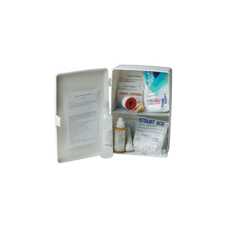 armadietto pronto soccorso completo di garze, cerotti, bende, cotone idrofilo e ghiaccio istantaneo