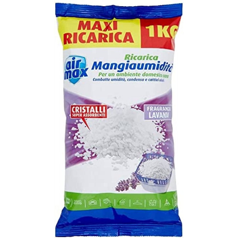 le ricariche air max sali per kit assorbiumidità assorbono umidità in eccesso, contrastano il formarsi di muffe e di macchie sui muri e combattono i cattivi odori. la chiusura "apri e chiudi" permette la conservazione del prodotto. il formato da 1kg permette di ricaricare più volte un kit sali assorbiumidità air max da 450gr. disponibile in diverse fragranze.