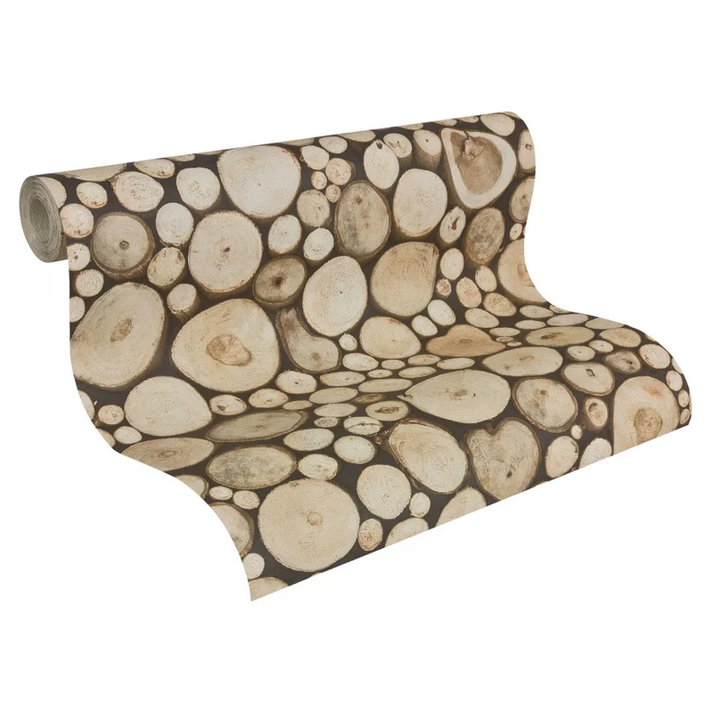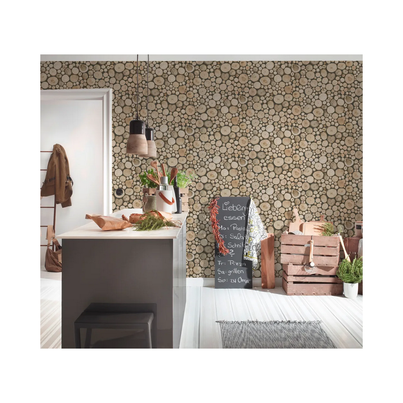 Rivestimento da muro con disegno realistico di tronchi in legno tagliati, effetto chalet di montagna, grazie a questo realistico disegno crea uno scenario straordinario, ideale per case giovani o open space o per decorare la parete dietro il divano o il letto.