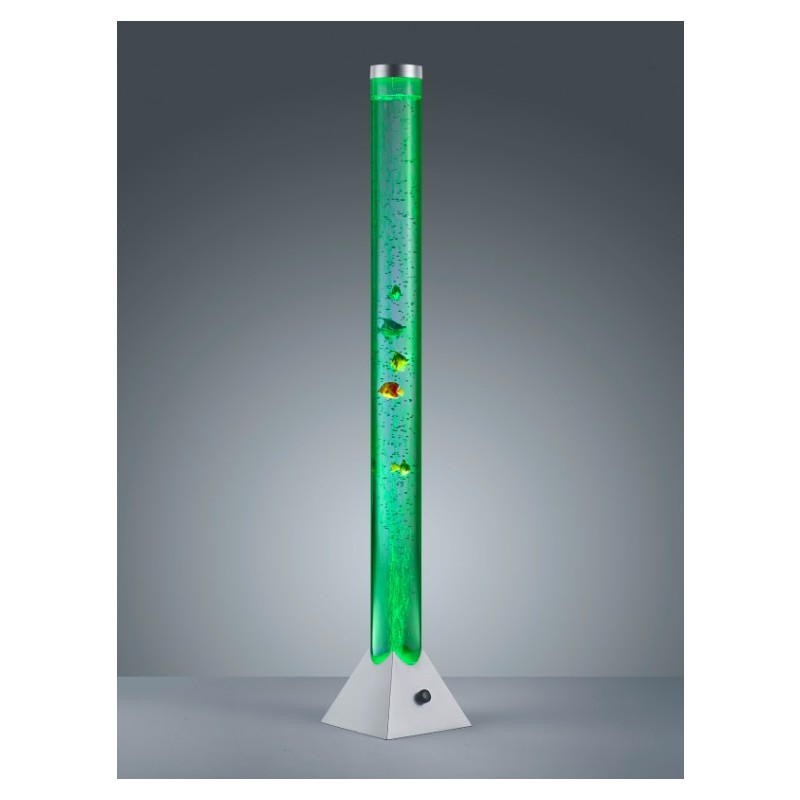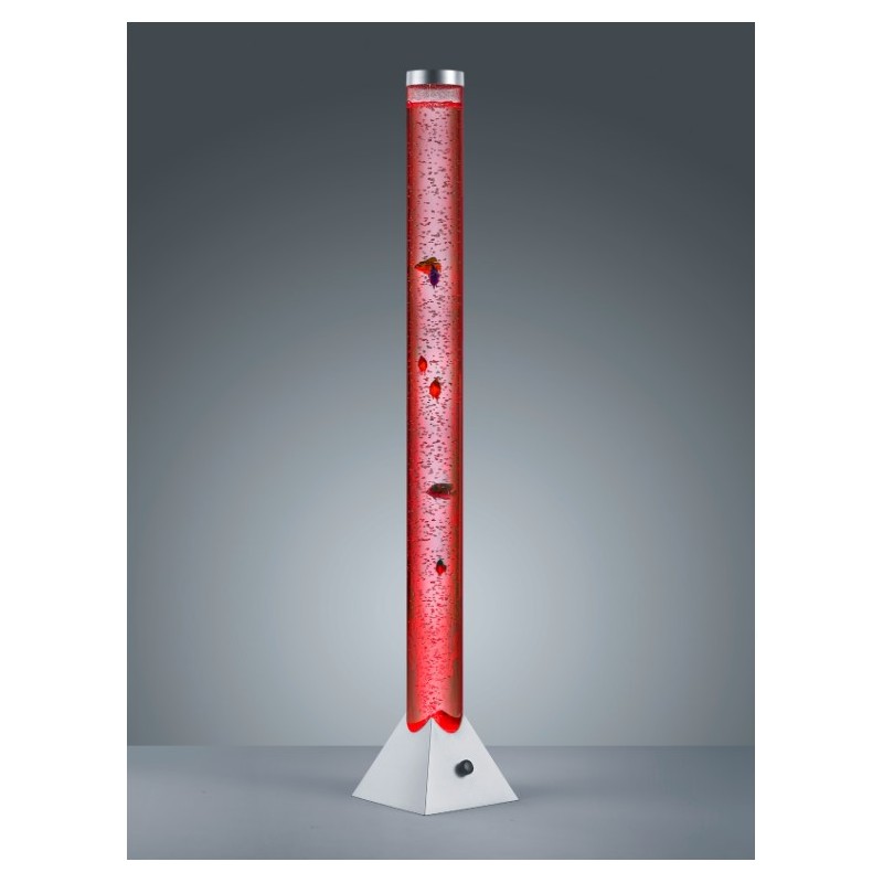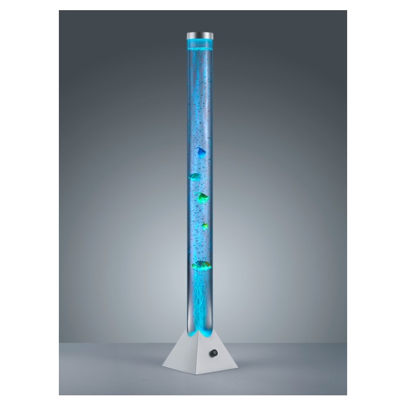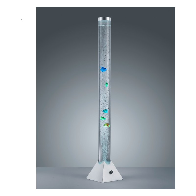 Piantana con struttura e diffusore in plastica trasparente, all'interno sono presenti dei pesciolini in acrilico colorato che si muovono quando la lampada è riempita d'acqua e accesa.