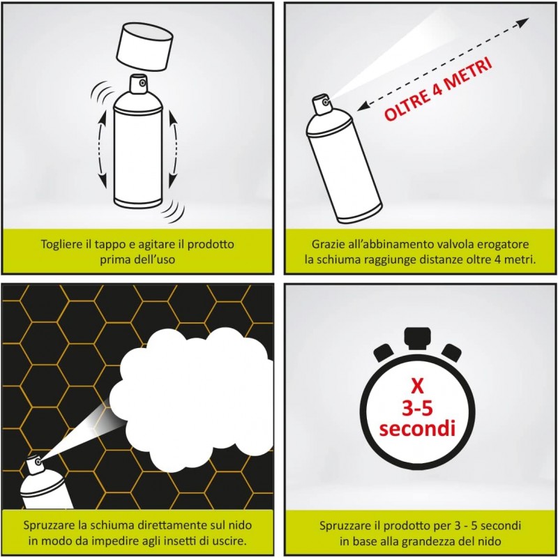 TECNOLOGIA SCHIUMA BLOCCA-NIDO: A differenza dei normali spray liquidi, questo schiumogeno vespe e calabroni eroga una densa schiuma coprente che avvolge istantaneamente il nido. Questa barriera fisica impedisce agli insetti di volare fuori e reagire, intrappolandoli all'interno e garantendo una disinfestazione sicura senza rischi di attacchi allo sciame.