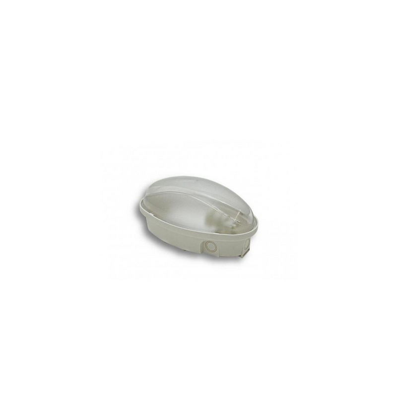 Plafoniera bianca ovale. IP65 60 watt E27. Base da 215x125x110. 3 ingressi cavo periferici + 1 sul fondo. Per lampade a incandescenza max 60W o fluorescenti a basso consumo max PL11 lunga 145 mm.