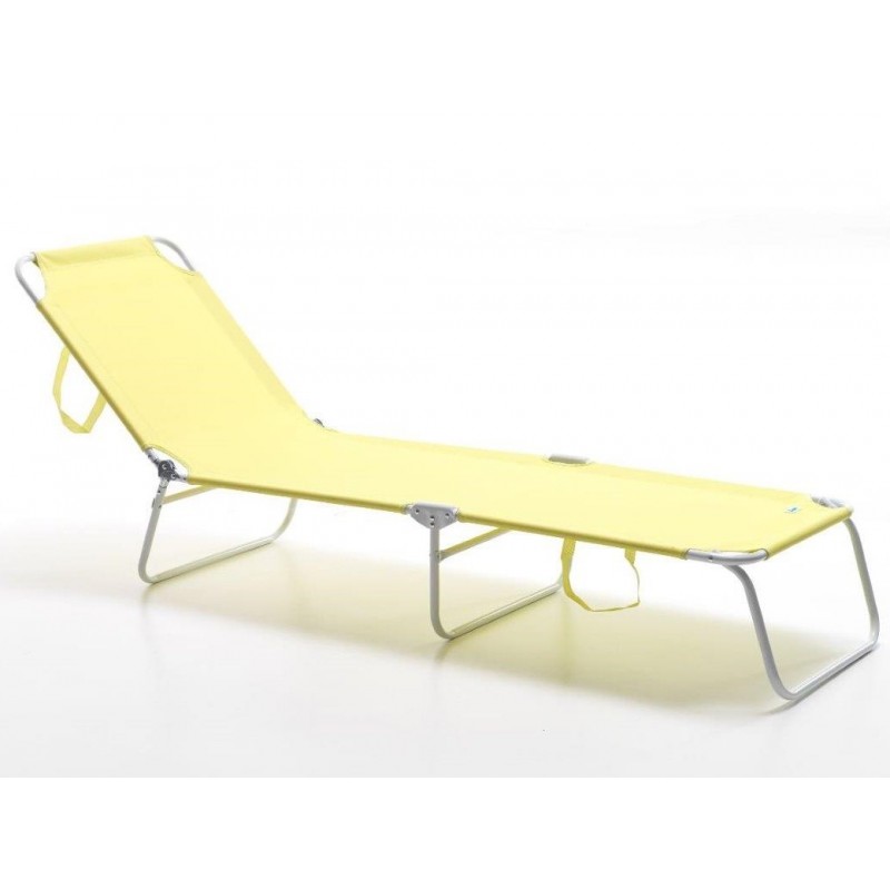 Brandina pieghevole 3 pezzi, struttura in alluminio anodizzato, telo in textilene 450g/m2 di colore giallo, schienale reclinabile multi-posizione con meccanismo a cricchetto, maniglie da trasporto.