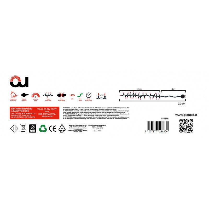 GLOUPIE Luci Di Natale Adatte Sia Ad Un Uso Esterno Che Interno Della Linea Compact 39 Metri (34 Metri Con Luci, 5 Di Solo Cavo Per Un Facile Collegamento Alla Presa Di Corrente Domestica), Con 1500 Led Dalla Colorazione Bianco Calda 31 V 22,5 W, Certificazione IP44, Cavo Verde Con Distanza Luci 2,2 Cm E Alimentazione Via Trasformatore A Bassa Tensione 220-240Vac 31Vdc 290MA 9 W, Funzione Memoria Timer 8 Ore On/16 Ore Off, 8 Giochi Luce