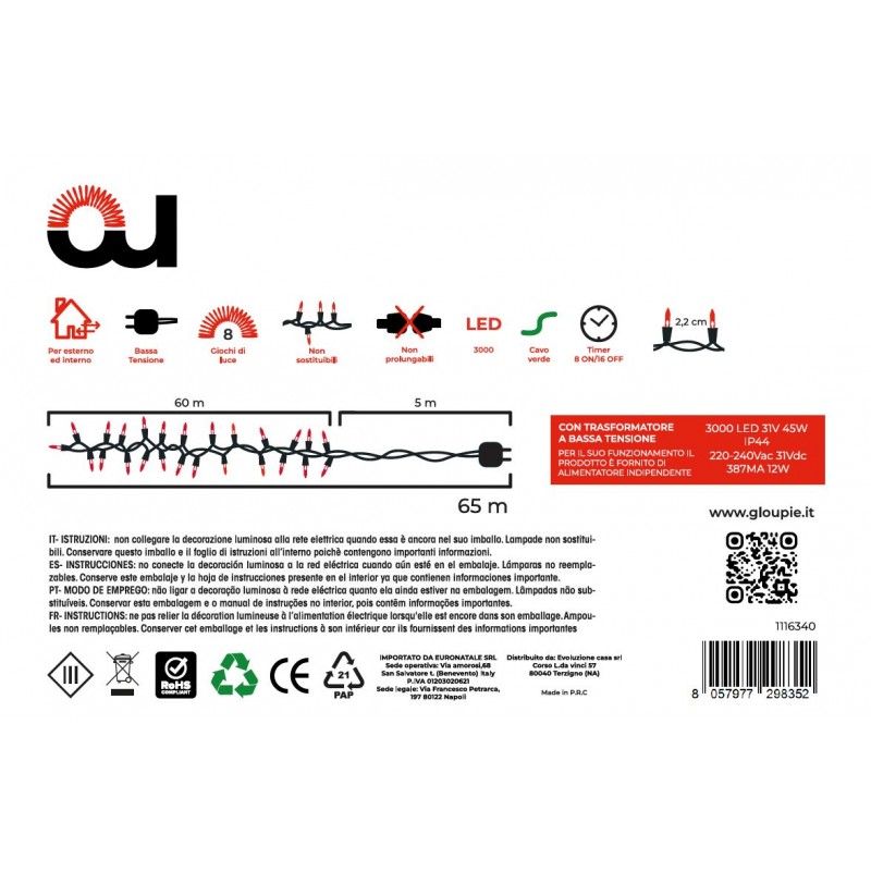 Le Luci Compact, Alimentate Da Un Trasformatore A Bassa Tensione 220-240Vac 31Vdc 387Ma 12W, Offrono 3000 Led A Luce Calda (31V 30W) Per Creare Un'Atmosfera Magica E Accogliente. Grazie Alla Funzione Memoria, Potrai Ripristinare Facilmente L'Ultimo Effetto Luminoso Utilizzato. Inoltre, Il Timer Integrato (8 Ore On/16 Ore Off) Ti Permetterà Di Impostare L'Accensione E Lo Spegnimento Automatico, Senza Dover Pensare A Nulla