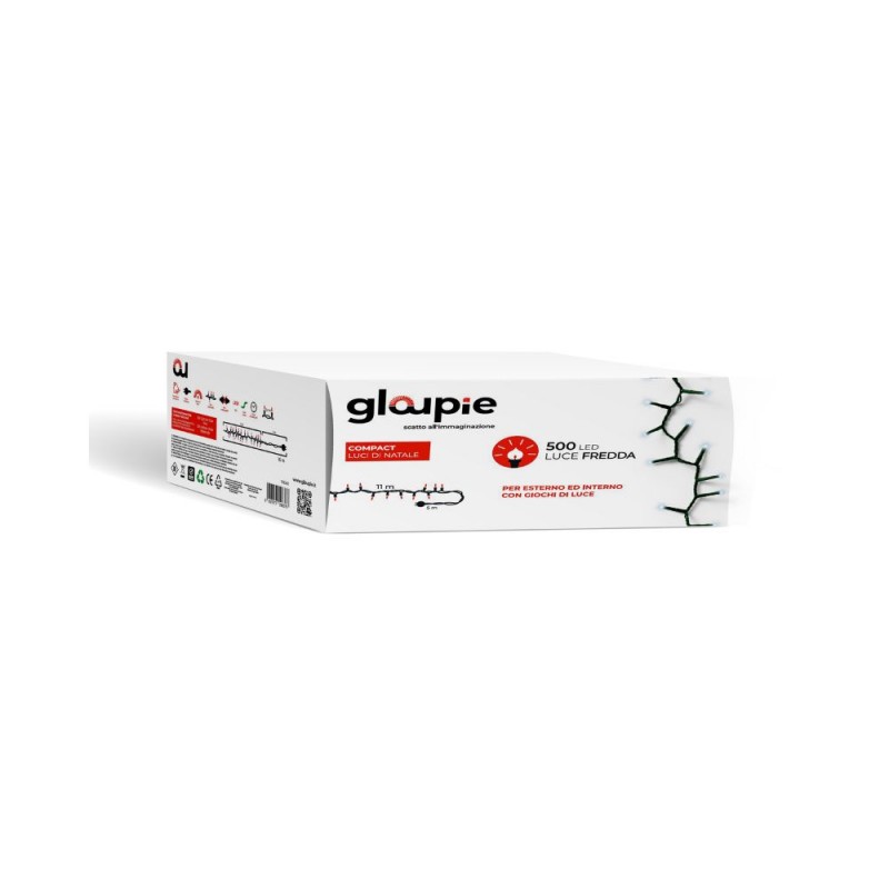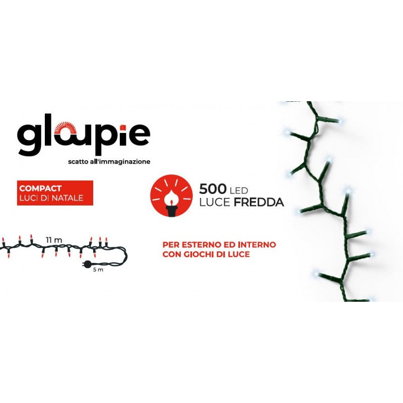 Avvolgi La Tua Casa In Un'Atmosfera Incantevole Con Le Luci Gloupie Compact. La Loro Fredda Luce Bianca, Diffusa Da 500 Led Suddivisi Su Di Un Cavo Verde Lungo 16 Metri (11 Metri Di Luci Con Distanza Fra Loro Di 2,2 Cm e 5 Metri Di Solo Cavo Per Un Migliore Collegamento Alla Presa Domestica), Creerà Un'Atmosfera Festosa E Moderna. Ideali Sia Su Alberi Di Natale, Balconi, Facciate, O Qualsivoglia Spazio E Oggetto Interno O Esterno