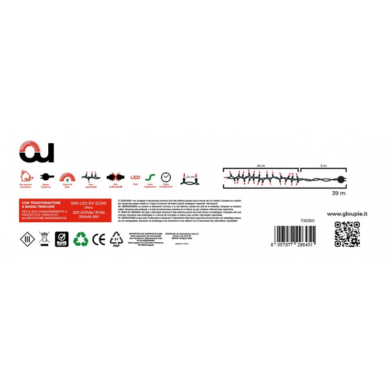 Avvolgi La Tua Casa In Un'Atmosfera Incantevole Con Le Luci Gloupie Compact. La Loro Luce Multicolore Dalle Varie Tonalità (Rosso, Verde, Blu, Giallo), Diffusa Da 1500 Led Suddivisi Su Di Un Cavo Verde Lungo 39 Metri (34 Metri Di Luci Con Distanza Fra Loro Di 2,2 Cm e 5 Metri Di Solo Cavo Per Un Migliore Collegamento Alla Presa Domestica), Creerà Un'Atmosfera Festosa E Moderna. Ideali Sia Su Balconi, Facciate, O Qualsivoglia Spazio E Oggetto Interno O Esterno